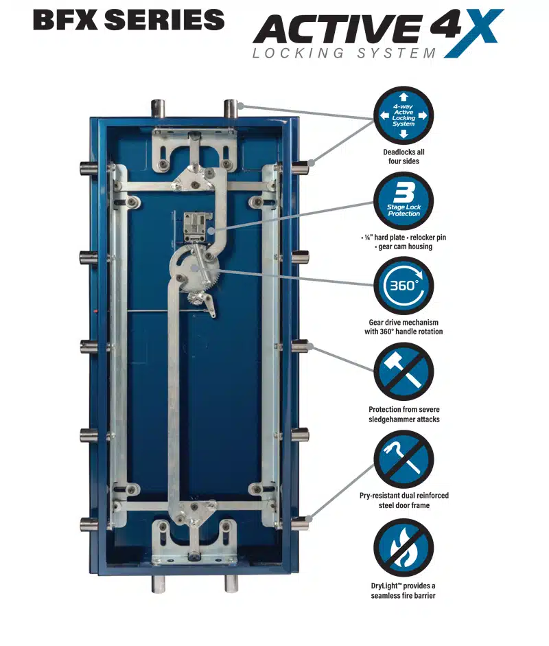 FeaturesDual Reinforced Door Frame; Anchor Holes Provided; Active 4X Locking System; Dual Door Seals to Protect Against Fire and Smoke; Industry’s Most Flexible Interior